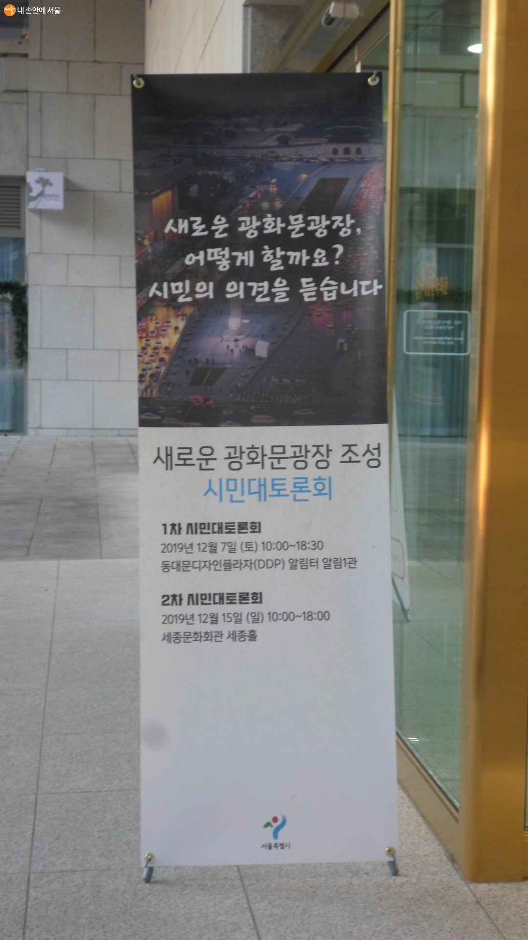 2019년 12월 15일 오전 9시 40분, 새로운 광화문광장 조성 2차 시민대토론회에 참석하기 위해 세종문화회관 세종홀 후문으로 들어갔다. 진행자의 말로는 워낙 광화문광장에 시위가 많이 열리고 이로 인해 자칫 토론회를 못 열 상황을 막기 위한 최소한의 조치였다고 했다. 문자를 입구에 있는 직원에게 제시해야 입장할 수 있도록 한 것도 그런 연유였다.