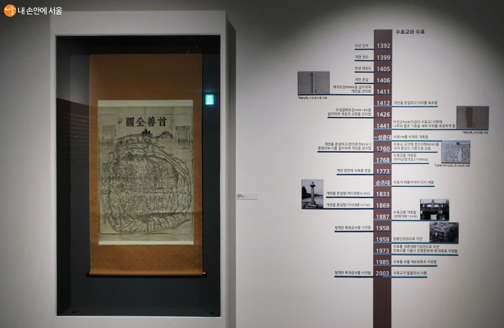 수선(首善)을 현대 용어로 표현하면 수도이기 때문에 수선 전도는 수도인 ‘서울의 지도’라는 뜻이다. 지도 위에는 제작자가 표기되어 있지 않지만 다른 자료에 나오는 기록을 종합해 김정호가 제작한 지도임이 밝혀졌다. 목판본 서울 지도 중 가장 큰 편에 속하며, 산과 산줄기를 채색 필사본 못지 않게 예술적으로 표현하여 소장품으로서의 가치도 높다. 이에 따라 민간에서 상당한 인기를 끌었으며, 1880년대 이후 외국 선교사가 채색 필사본 한글 서울 지도를 만들 때 모본이 되기도 했다. 1392년 조선 건국부터 1406년 개천 준설, 1985년 수표를 보물 제838호로 지정, 2003년 청계천 복개공사를 시작한 걸 연대별로 잘 정리되어 있어서 수표교의 역사를 한눈에 알 수 있다.