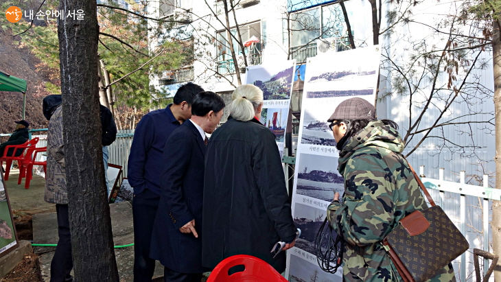 시민들이 밤섬 사진들을 보며 옛 이야기를 나누고 있다 ©이선미
