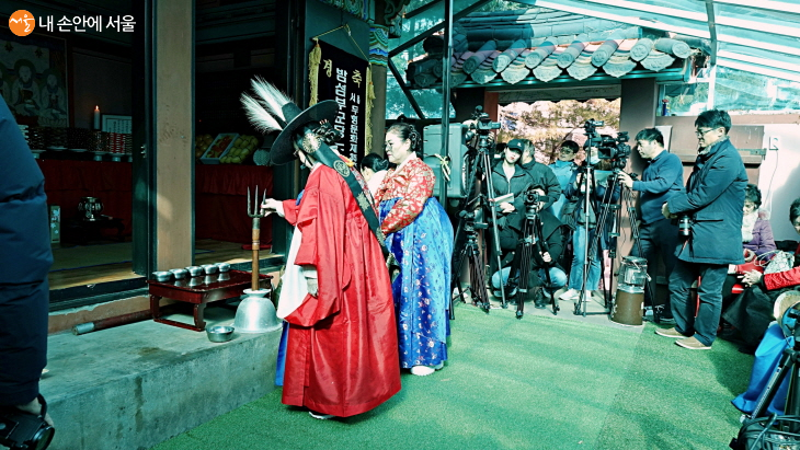 어렵사리 밤섬부군당을 찾아갔다. 공민왕 사당을 지나 아파트 사이 오솔길을 따라 들어간 부군당은 좀 비좁았다. 원래는 좀 더 높은 곳에 밤섬을 내려다보며 있었지만 아파트를 짓기 위해 또 한 번 옮겨야 했다. 많은 시민들이 부군당을 가득 채우고 있었다.