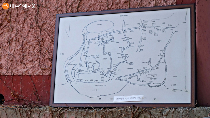 부군당 한쪽에 이주하기 전 밤섬의 약도. 옛 밤섬에는 드문 성씨인 함씨, 판씨, 표씨 등이 많이 살았다 ©이선미