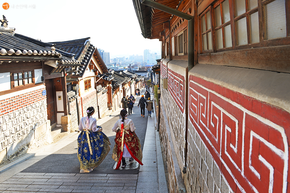 북촌로 11길 (가회동)북쪽에서 남쪽을 바라보는 골목길을 따라 한복을 입은 관광객이 걷고 있다 ©오도연