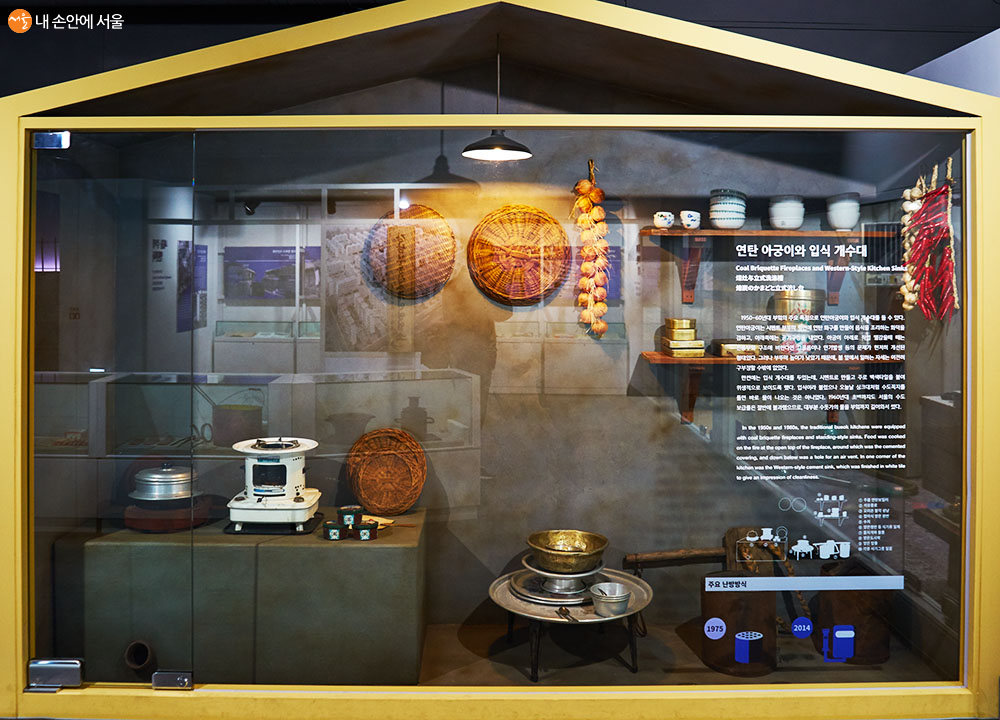 1950~60년대 부엌의 모습. 연탄 아궁이와 시멘트 부뚜막, 석유풍로 등이 전시되어 있다 ⓒ이정규
