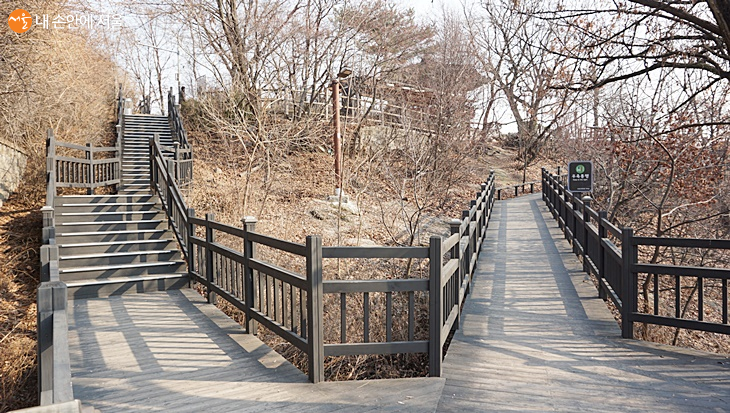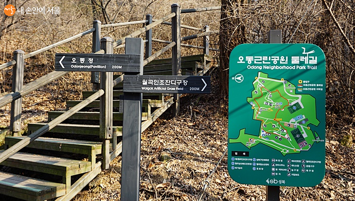 오동근린공원은 전국토의 76%가 산지인 우리나라에서 쉽게 볼 수 있는 산지형 도시공원이다. 오동근린공원에는 마스크를 끼고 산행을 즐기는 사람들이 적지 않았다. 겨울 산의 분위기를 한껏 느끼며 천천히 오르면 오동근린공원 둘레길을 알리는 표지판과 나무 덱으로 펼쳐진 계단길이 보이기 시작한다.