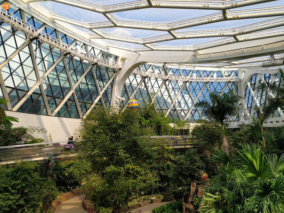 온실을 가로지르는 2층 높이의 스카이워크는 서울식물원에서 꼭 방문해야할 곳이다. 식물과 관람객을 같이 볼 수 있는 매력이 있다. 나무 사이를 뛰어다니는 아이들, 이곳저곳에서 셀카 찍는 연인들, 나무 구경하는 사람들 모습은 보기만 해도 행복이 차오른다. 스카이워크는 계단과 엘리베이터로 오를 수 있다. 스카이워크는 계단으로 올라가는 것을 추천한다. 하얀색으로 작은 구멍이 뚫려 있고, 하얀색 조명으로 감싼 원형 계단은 디자인적으로도 훌륭하다.