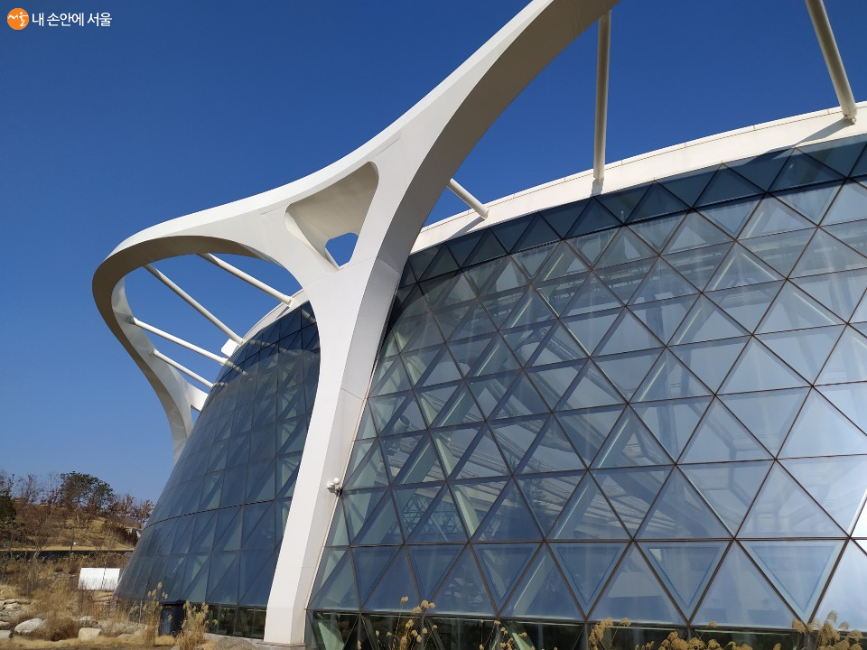 저 멀리 흰색 곡선으로 유리온실을 감싼 서울식물원 전경이 보인다. 겨울이라 잎을 잃어버린 쓸쓸한 나무와 대비되어 흰색 건축물이 눈에 띈다. 온실을 둘러싸고 있는 정원(바람의 정원, 오늘의 정원, 추억의 정원, 사색의 정원, 초대의 정원, 치유의 정원, 정원사의 정원, 숲 정원)의 모든 산책로는 자연스럽게 온실과 연결되어 자연스럽게 관람객을 인도한다.