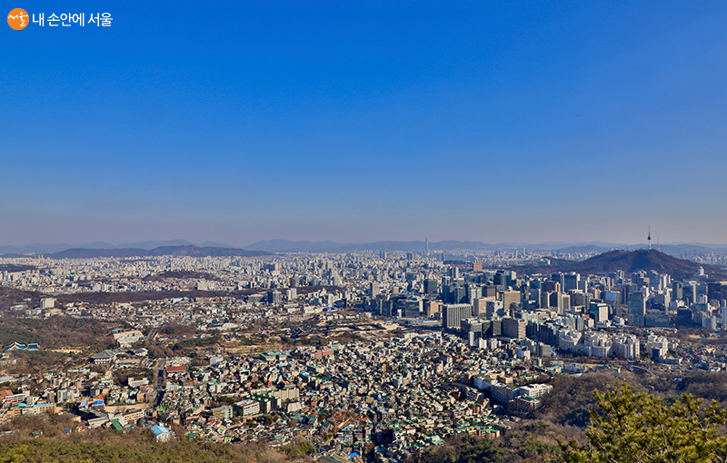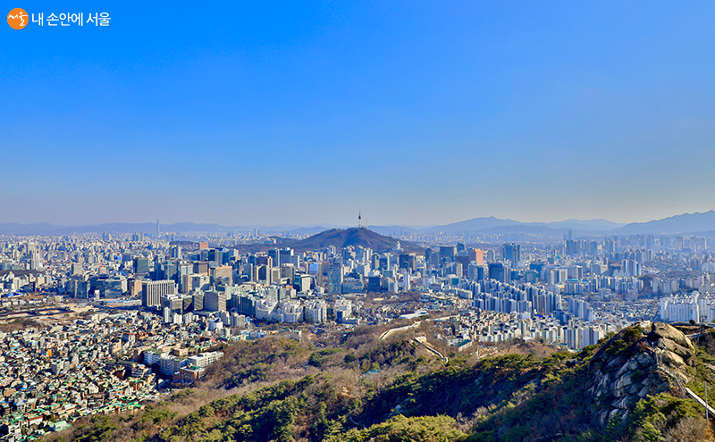 인왕산 정상에서 바라본 서울 전경, 멀리 강남의 초고층 빌딩도 보일 정도로 맑은 날씨 ⓒ양인억