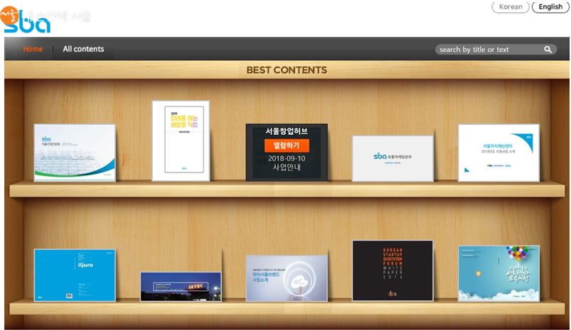 서울산업진흥원은 E BOOK 자료실(http://ebook.sba.kr/)을 운영하고 있다. 자료실에 들어가면 창업, 유통마케팅, 일자리창출, 애니콘텐츠, 지식재산, 서울창업허브, 강소기업, 투자자, 정부 사업안내 등 다양한 카테고리가 나온다. 이 중 원하는 카테고리를 클릭하면 다양한 E BOOK을 활용해 볼 수 있다.