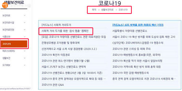 코로나19 사이트는 서울시 홈페이지-복지-생활보건의료-코로나19의 경로로 만들어져 있다. 이 게시판으로 들어가면 코로나19에 관련된 모든 정보를 확인할 수 있다. 클린존(방역안심시설), 발생동향(상황판 바로가기), 일일브리핑(생방송), 예방행동수칙&홍보물, 선별진료소, 관련 Q&A, 보도자료가 링크되어 있다. 최근에는 '잠시 멈춤' 캠페인 링크가 추가되었다.