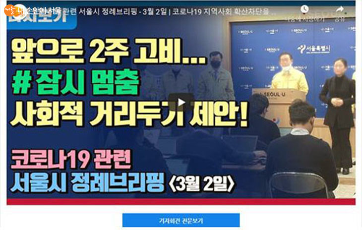 또한, 코로나19 관련 서울시 정례브리핑이 매일 오전 11시 생방송으로 진행한다. 클린존 계획 등 서울시 대응현황 보고는 물론 공기 감염, 중국발 택배 감염 가능 여부 등을 확인할 수 있다.