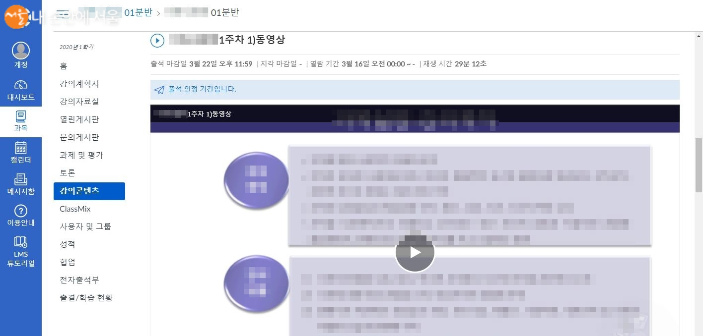 대학생인 필자의 본분으로 돌아가 사이버 강의를 직접 수강해보았다. 내가 듣는 수업은 학교 포털사이트 내의 ‘e-class’에 게시된 강의 영상을 시청하는 방식이었다. 영상을 재생할 수 있는 기한이 정해져있고, 기한 안에 영상을 시청하면 출석 처리도 완료된다. 미리 녹화된 강의를 재생하는 거라 정해진 기간 내에는 내가 편할 때 강의를 들을 수 있고 놓친 부분은 얼마든지 돌려볼 수 있어 편리하다. 요즘 학생들은 교수에 양해를 구하고 수업 내용을 녹음해서 다시 들으며 공부하기도 하는데 이런 면은 나름 사이버 강의의 장점이었다.