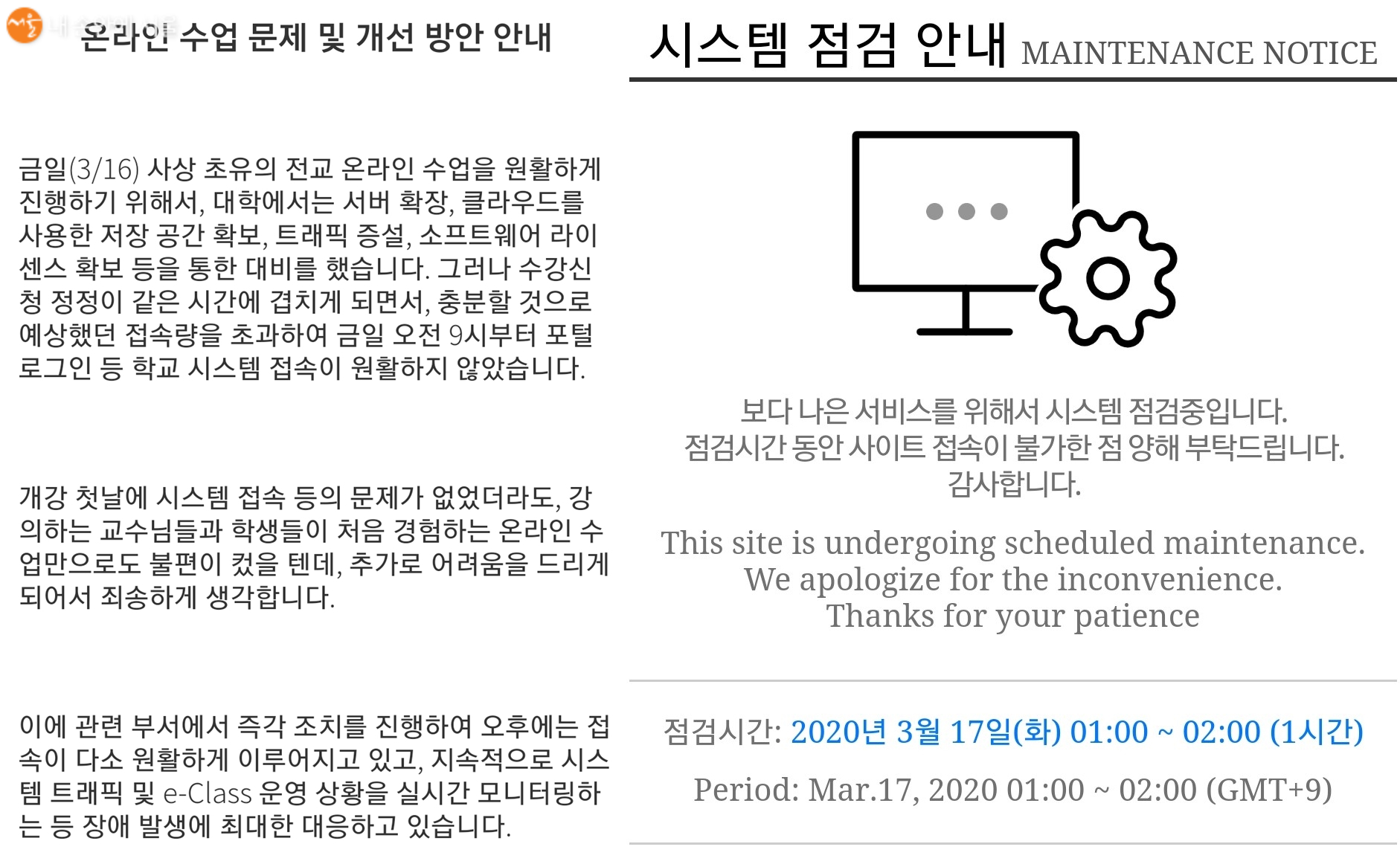 하지만 대부분의 대학에서 이런 대대적인 사이버 강의를 처음 시행한 것인 만큼 시행착오도 분명히 있었다. 온라인 개강을 맞아 사이버 강의와 수강정정이 열리는 사이트에 수천, 수만 명의 학생들이 동시에 접속하니 서버가 마비돼 이용에 어려움을 겪었다. 일부 교수들은 지침대로 사이버 강의를 실시하는 대신 과제나 정상화 후의 보강을 택하기도 했다.