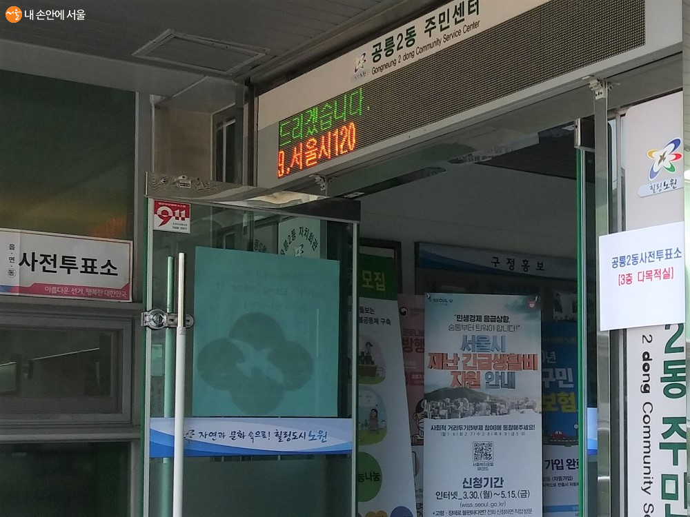 활짝 열려 있는 사전투표소 건물 입구 ⓒ이봉덕