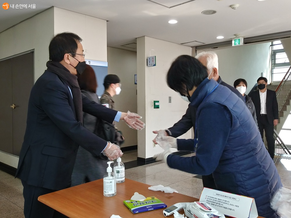 3층 투표소 입구에 올라오니 투표 진행 요원들이 시민들의 방역을 철저히 실시하고 있었다. 투표를 위해 마스크 착용은 필수다. 투표 차례가 되면 한 사람씩 먼저 발열 체크를 하고, 손 세정제로 손을 닦은 후, 위생 장갑을 끼고 투표소에 입장하게 된다. 투표소에 들어가기 위해 투표소 입구에 있는 진행 요원의 안내를 받아 차례를 기다렸다.