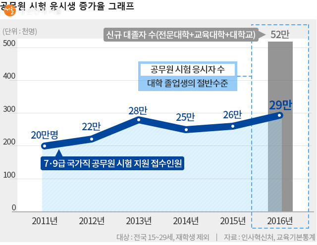 개인의 가치관이 다양해지면서, 사회 초년생의 직업 선택 기준도 안정적인 직장 생활과 급여 보장, 개인 시간, 퇴사 후 복지 등으로 다양화 되었다. 최근에는 이런 점들을 만족시키는 공무원에 대한 관심이 늘어나고 있다. 인사혁신처 교육 기본통계에 따르면 국가직공무원 응시생이 대학 졸업생의 절반 수준에 이를 정도이다. 상당한 증가 추세를 보이고 있는 것을 알 수 있다.