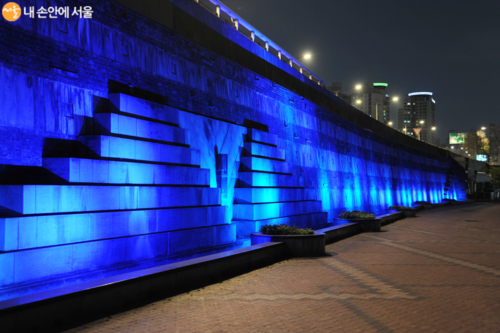 ‘서울시 블루라이트 캠페인’에 참여 중인 이촌한강공원(옥수지구)의 벽천분수대 ⓒ조수봉