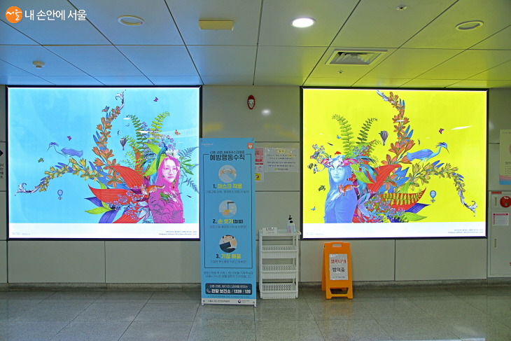 청년들이 많이 왕래하는 성신여대역의 경쾌하고 기발한 작품 ‘서쪽의 미스김’, ’동쪽의 미스김’. 손세정제와 예방수칙과 함께 배치돼 코로나19 상황이 여실히 드러나는 전시공간이다. ⓒ이선미