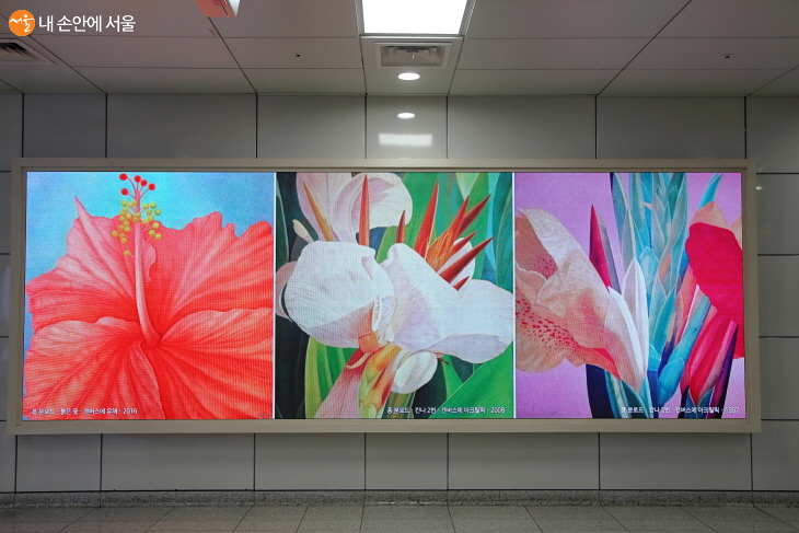 신설동역에 설치된 아트캔버스에 버즈아트 소속 작가들의 작품이 소개되었다. 태국 작가 퐁 분로드의 매혹적인 꽃그림들 ⓒ이선미