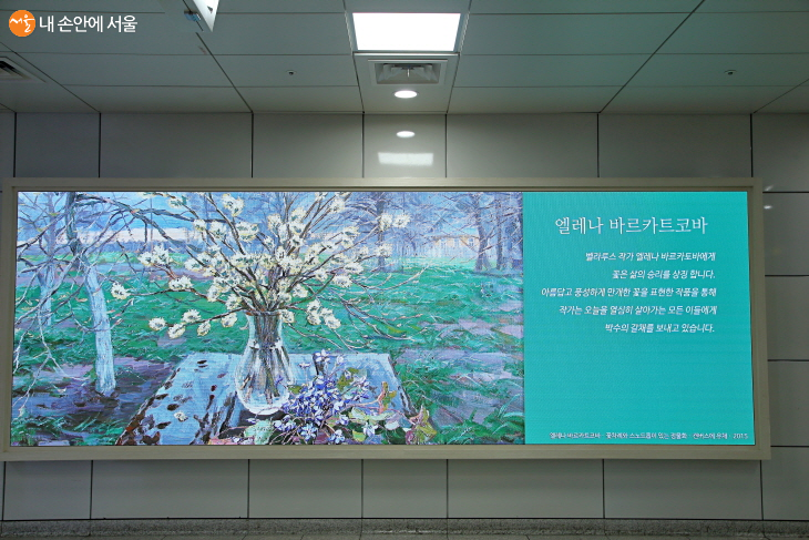 신설동역에서 특히 눈에 띈 건 ‘버즈아트’ 작가들의 작품이 펼쳐진 아트캔버스였다. 태국 작가 퐁 분로드와 벨라루스의 엘레나 바르카트코바, 우리나라 이예진 등 9인의 작가가 시민들에게 전하는 꽃들의 이야기가 시민들의 발길을 사로잡곤 했다. 워낙 규모가 큰 캔버스인데다 작품들이 무척이나 화사하고 강렬했다. 작가소개와 작품의 간략한 설명까지 덧붙여져 잠시 관람을 하는 시민들도 더 친밀하게 머무는 것 같았다.