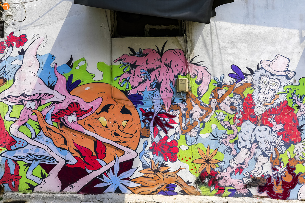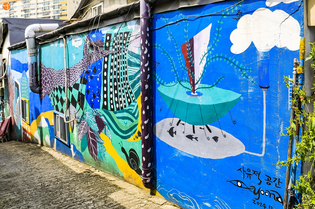 좁은 골목으로 들어서면, 벽면에는 개성 넘치는 벽화들이 이어져 있다 ©박우영