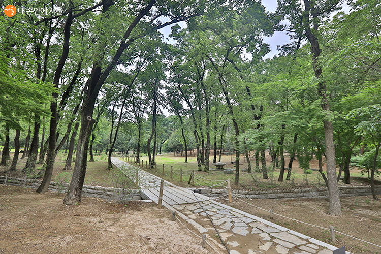 선릉의 동쪽에 위치한 정현왕후릉으로 연결된 신로가 왕릉 숲을 가로지르고 있다 ⓒ양인억