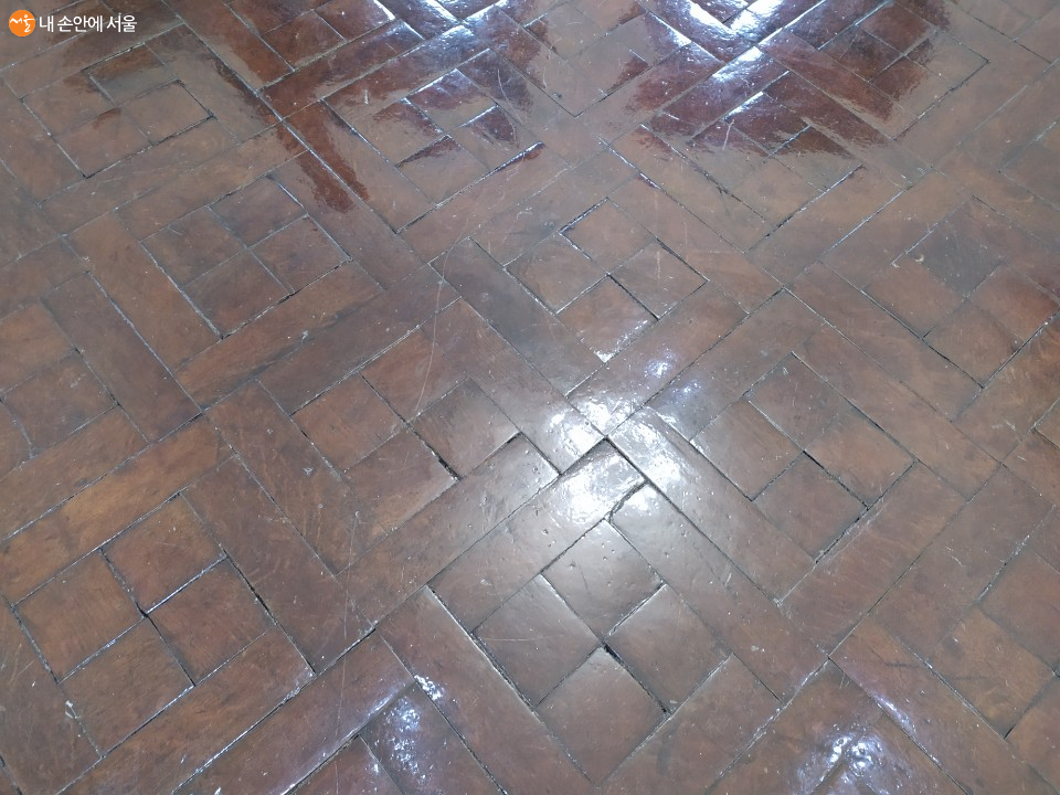 미술관 1층 마루 목재 바닥이 지그재그 격자모양으로 관리가 잘되어 빛나고 있다. ©조경석