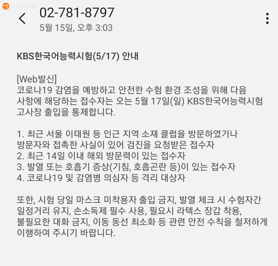시험이 있기 2일 전 KBS한국어능력시험과 관련해 안내 메시지가 도착했다. 코로나19 감염 예방을 위한 수험 환경 조성을 위해 이태원이나 인근 지역 소재 클럽을 방문하였거나 방문자와 접촉한 사람, 최근 14일 이내 해외 방문이력이 있는 접수자, 발열 또는 호흡기 증상이 있는 접수자 등 의심 대상자나 격리 대상자는 출입을 통제했다.