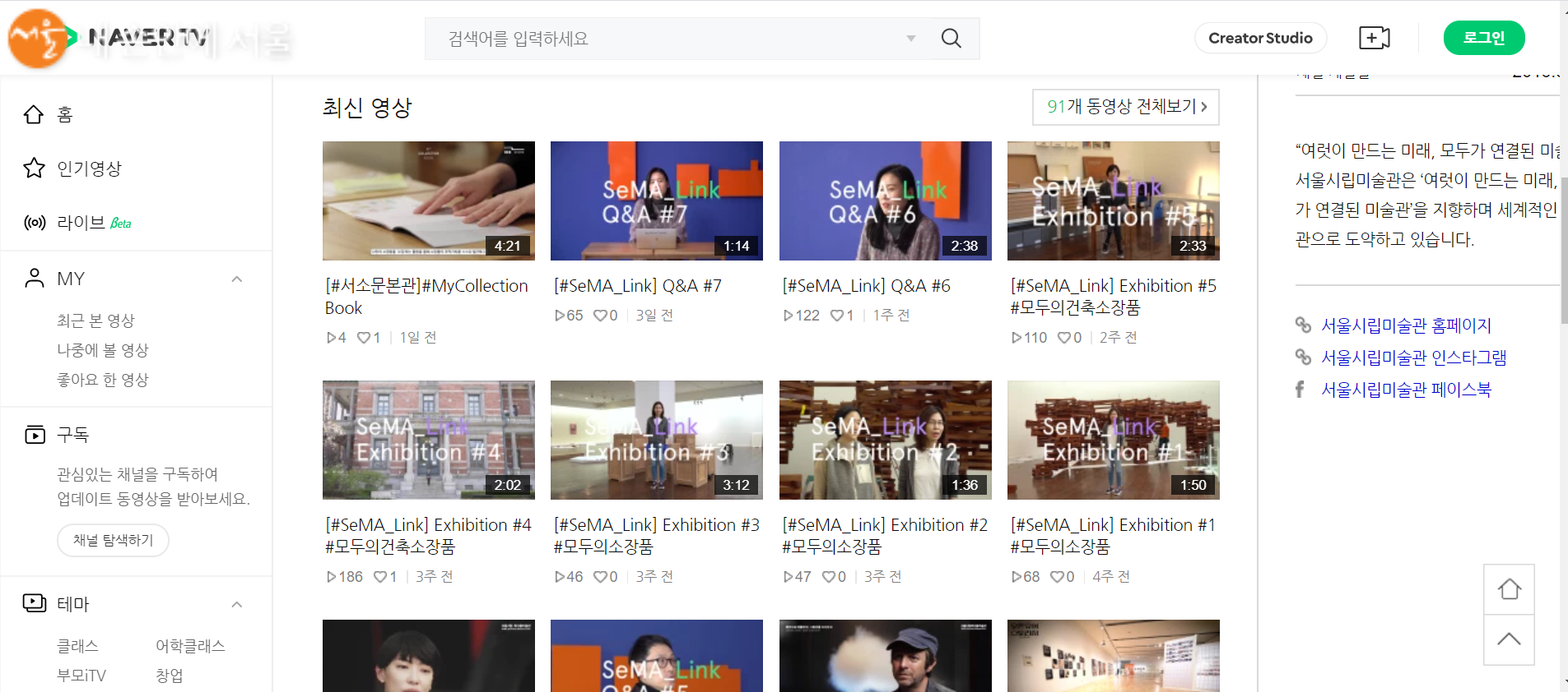 서울시립미술관 네이버TV 페이지. 미술 전시와 관련된 다양한 영상들이 게시되어 있다