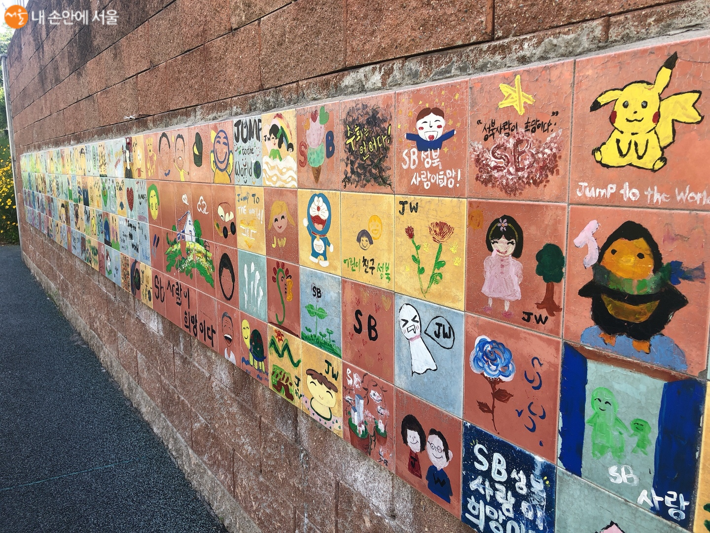 성북천에 있는 다리에 아이들이 그린 타일 그림을 벽에 붙여놓았다 ©송수아