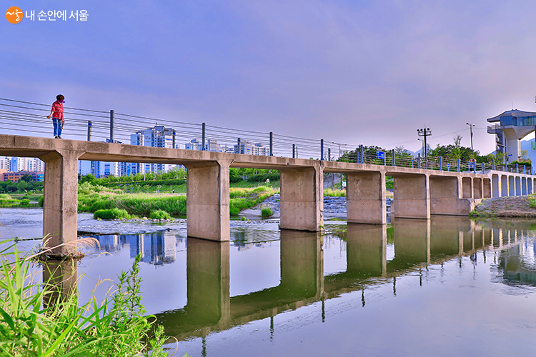 유속이 느려 물에 반영된 중랑천의 모습이 차분하고 여유롭다 ⓒ양인억