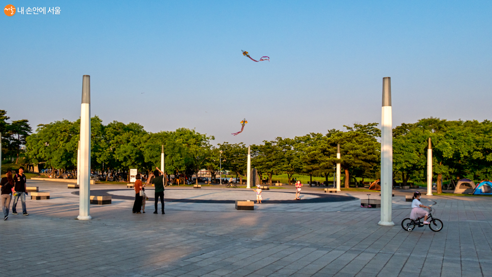낮에 연을 날리는 가족들의 모습이 정겨운 가운데 태양광 에너지를 축적하고 있는 솔라스퀘어 광장 ⓒ오세훈