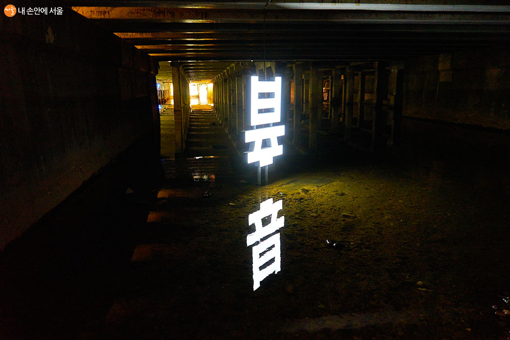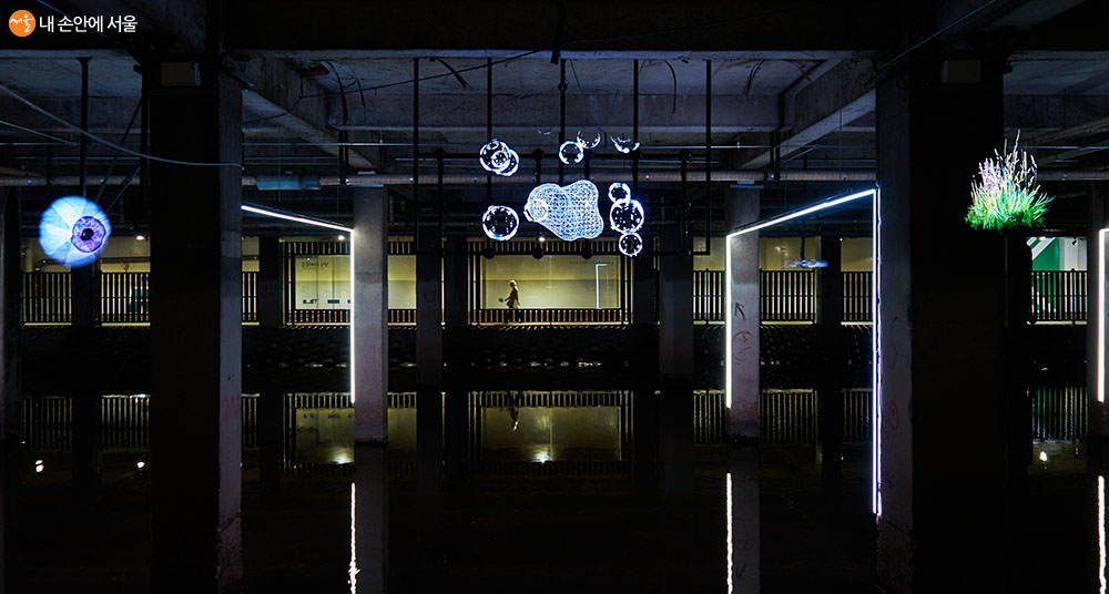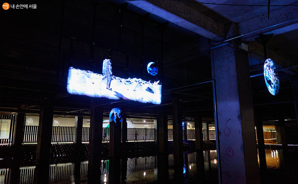 이제껏 닫혀있던 지하공간을 빛으로 다시 채우는 의미를 표현하는 작품인 'SunMoonMoonSun'(윤형민 작) ⓒ이정규