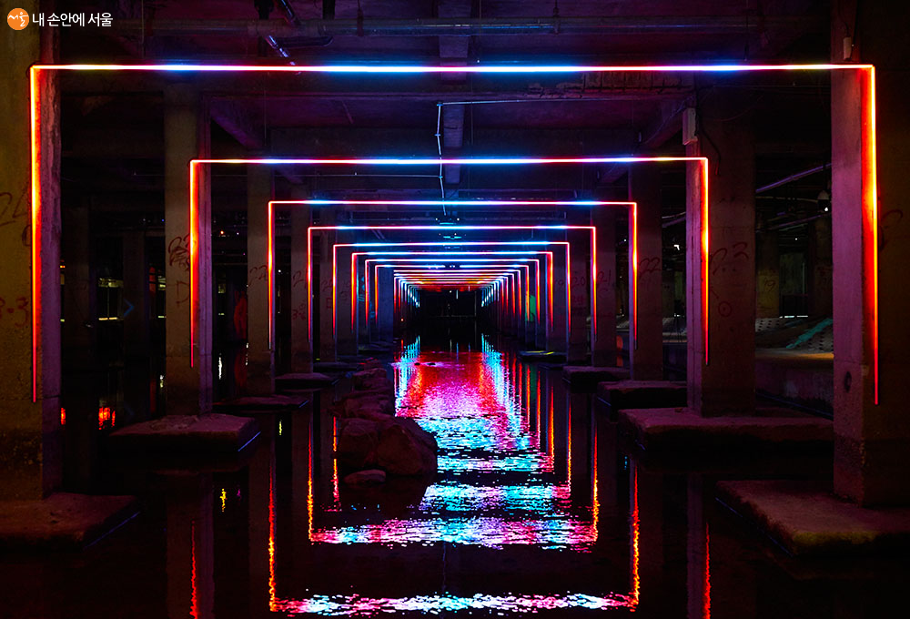 서대문구에 있는 유진상가 지하부의 홍제천길을 빛과 색의 공간으로 탈바꿈한 홍제유연(弘濟流緣)이 바로 그곳이다. 지난 50년간 버려지고 막혀있던 공간이 서울시 공공미술 프로젝트를 통해 환상적인 빛의 예술길로 재탄생했다. 홍제유연에는 빛, 소리, 색 등의 기술을 활용하여 제작된 8개의 예술작품이 설치되어 있다. 1,000명의 시민들과 인근 초등학교 학생들의 참여로 만든 시민참여 작품도 볼 수 있어 더욱 의미 있다. 유진상가 건물을 떠받치는 100여 개의 기둥과 그 사이로 흐르는 물길을 따라 설치된 예술작품들을 보노라면 음습한 지하공간이 화려한 빛의 미술관으로 변한 것이 그저 놀라울 따름이다. 인연이 흘러 화합한다는 뜻을 담고 있는 이름처럼 홍제유연이 많은 시민들의 사랑을 받는 명소가 될 것 같은 예감이 든다.