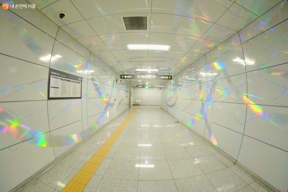 홀로그램 시트로 역동적인 느낌을 주는 솔밭공원역 지하 통로, 오택관 작가 작품 ⓒ권순영