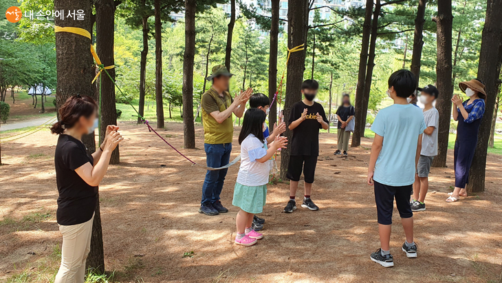 지난 7월 9일 오후, 도봉구 밤골어린이공원에서는 큰 나무에 굵은 밧줄을 연결하고, 밧줄 다리와 그네를 만들었다. 엄마, 아빠와 함께 어린이들이 공원에 모이기 시작했다. 코로나19로 인해 체온 체크와 마스크 착용은 필수였다. 잣나무 숲에 모인 어린이들은 눈을 감고, 자연을 느끼며 숲과 친해지는 시간을 가졌다. 어린이들과 인사를 나누고, 몸 놀이와 공원 탐방으로 첫 만남의 어색한 분위기를 부드럽게 바꾸어 나갔다.