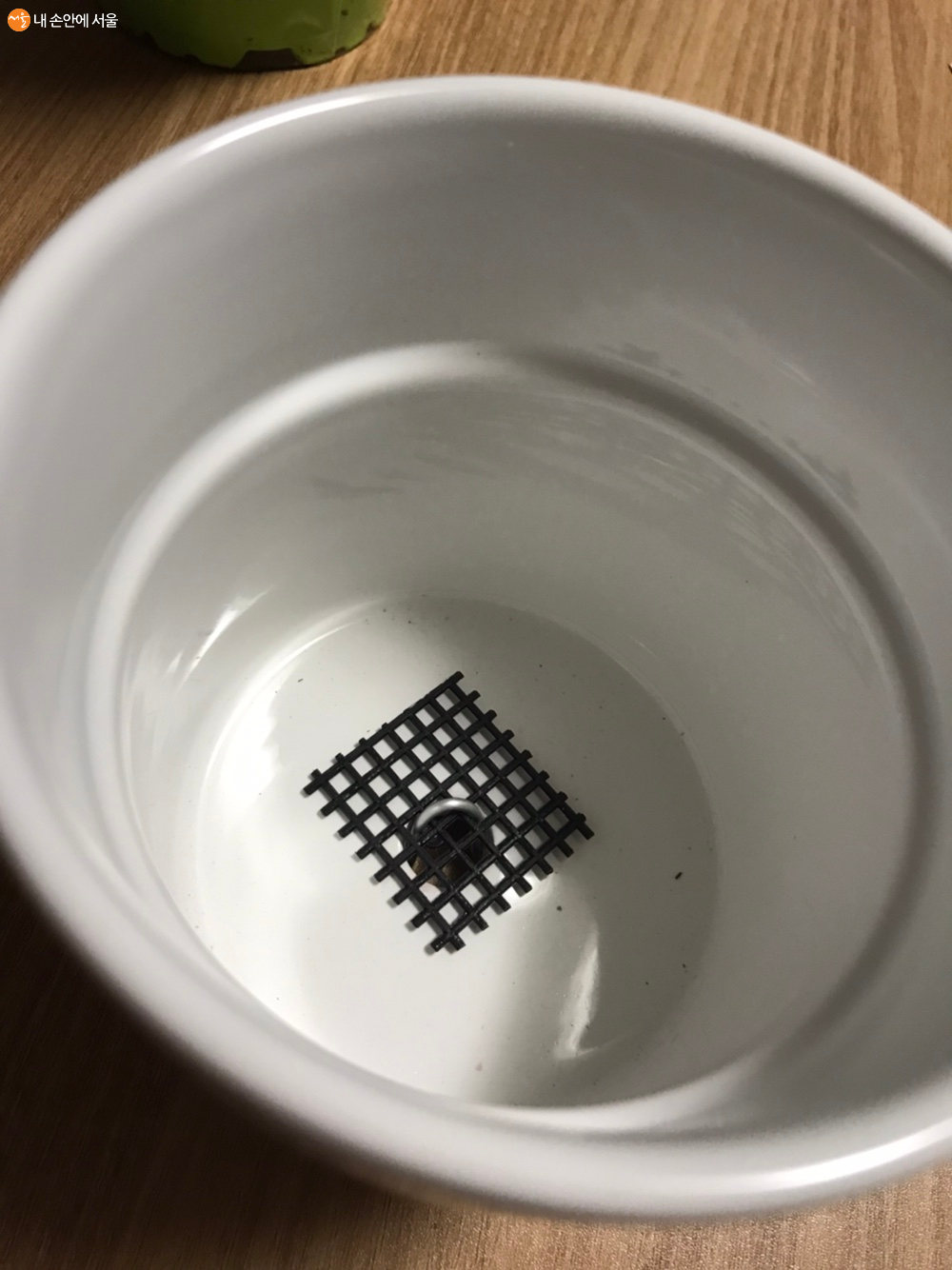 1. 화분 아래 배수구에 망을 깔고 알루미늄 와이어를 끼어 넣어 고정한다. 손이 다칠 수 있으니 어린이는 보호자의 지도가 필요하다.