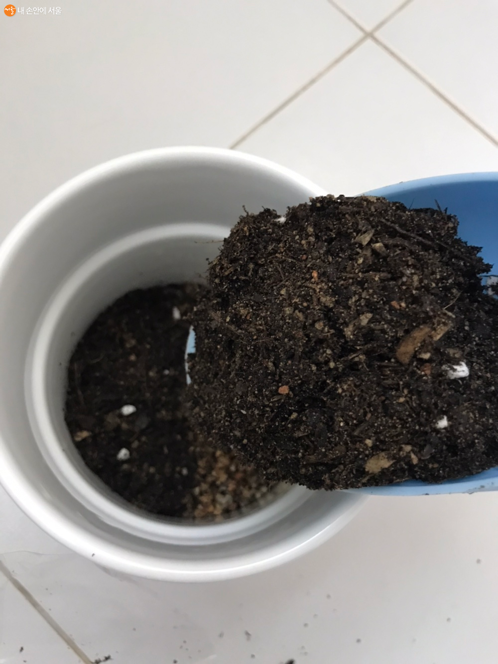 3. 분갈이 흙을 화분의 1/3정도 넣어준다.
