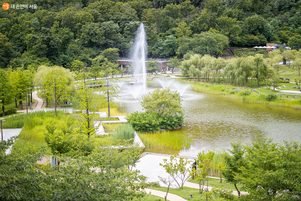 '초화원' 전망대에서 바라본 '월영지'에서 시원한 분수쇼가 펼쳐지고 있다 ©임중빈