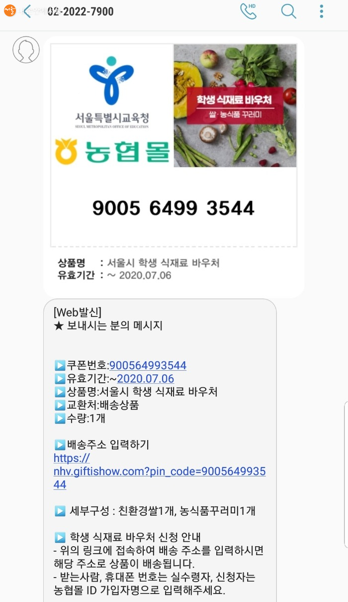 마침 쌀이 떨어져서 언제쯤 배송이 되나 기다리던 차였다. 모바일 쿠폰은 내가 원하는 상품을 구매하는 것이 아닌 친환경 쌀과 식재료 꾸러미가 랜덤으로 발송된다. 농협몰 쿠폰번호가 문자메시지로 도착했고, 배송 주소를 입력하면 각 가정에 배송되는 시스템이다. 다자녀일 경우는 저학년 자녀부터 정보를 입력해야 했고, 7월 6일인 유효기간 내에 쿠폰 등록과 배송 주소 입력을 하지 않으면 자동 소멸된다. 나보다 더 어려운 사람들을 위해 기부하고 싶은 사람들을 위해 기부 링크도 따로 마련되어 링크 안에서 기부 의사를 밝힐 수도 있었다.