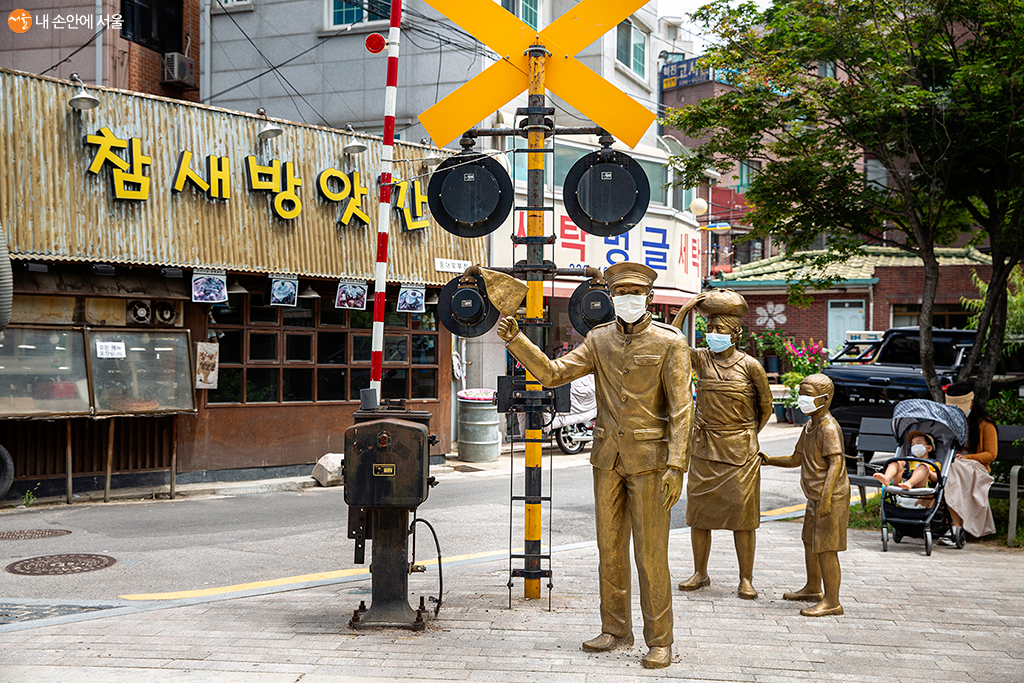향수를 부르는 땡땡거리의 역무원과 지나가는 동네 주민 조형물 ⓒ문청야