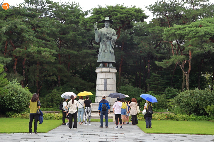우리나라 첫 사제인 김대건 신부 상 앞에서 절두산과 천주교 박해 설명을 듣고 있다. ⓒ이선미