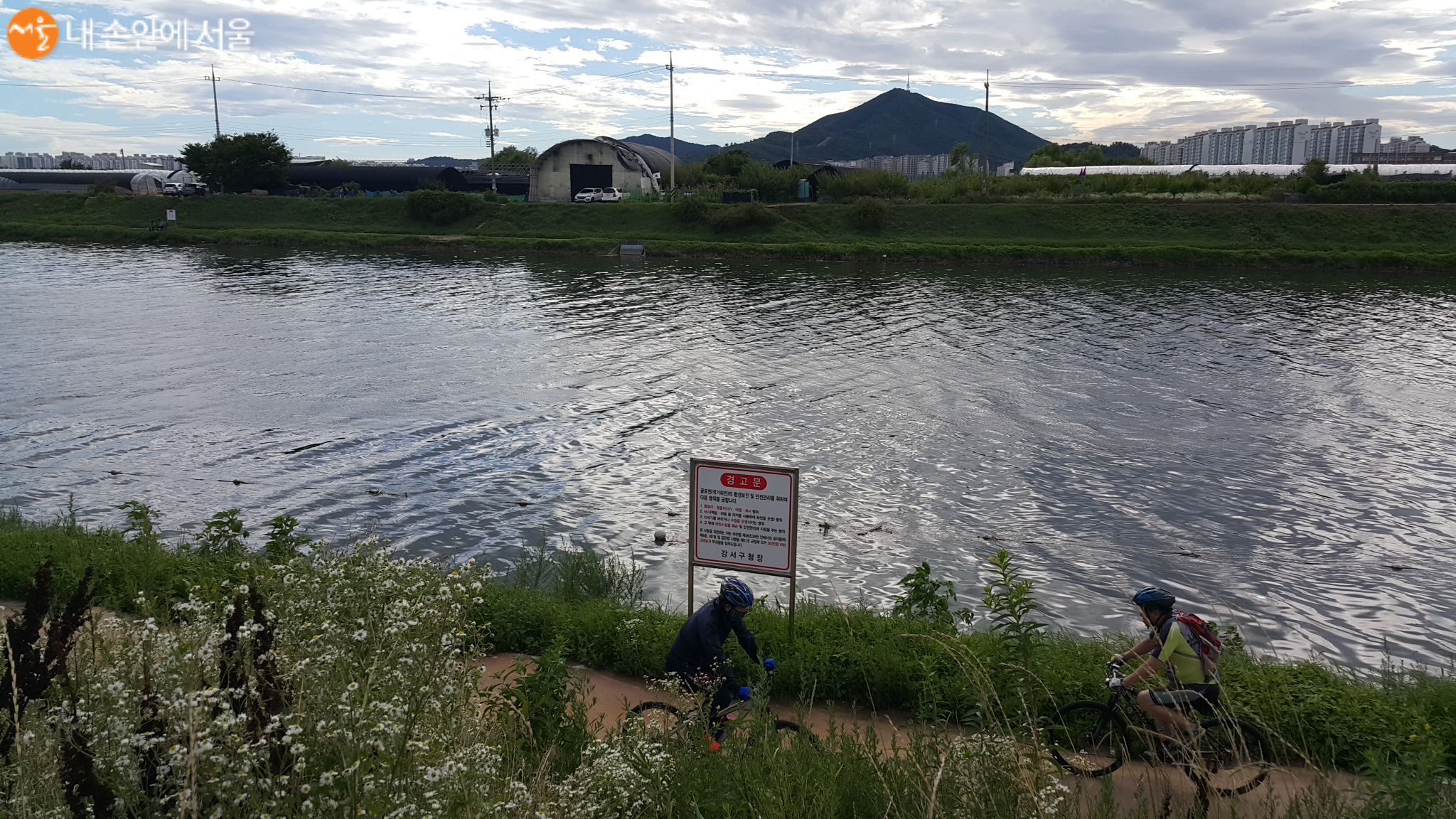 한강변을 따라가보니 경인아라뱃길과 굴포천까지 자전거를 타는 사람들이 많다. 하이킹을 즐기거나 여유로운 산책을 하는 시민, 낚시를 하는 사람들로 한가로운 풍경이 펼쳐진다. 굴포천 주변에는 강서구청장 명의의 수영금지 표지판과 가로등 관리 책임자 표지판이 있어 행정구역상 서울임을 알 수 있다.