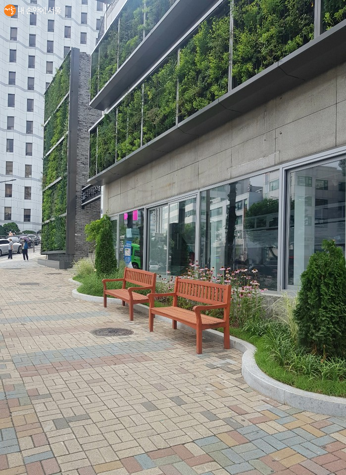 보는 것만으로 기분이 좋아지는 푸릇푸릇한 수직정원과 벤치 ©김민선