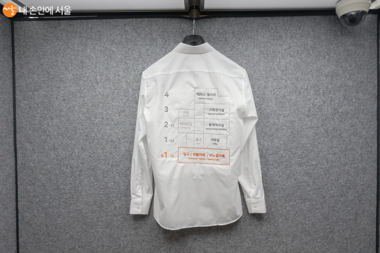 이음피움 봉제역사관의 엘리베이터 안에 각층을 안내하는 글을 수놓은 셔츠가 걸려있다 Ⓒ김인수
