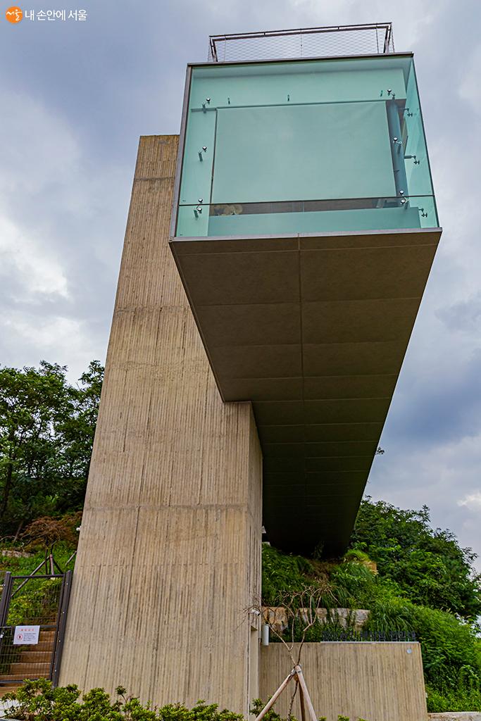채석장 전망대를 옆에서 바라보면 전망대인 가로축과 엘리베이터 세로축이 교차되어 있다 ⓒ유서경