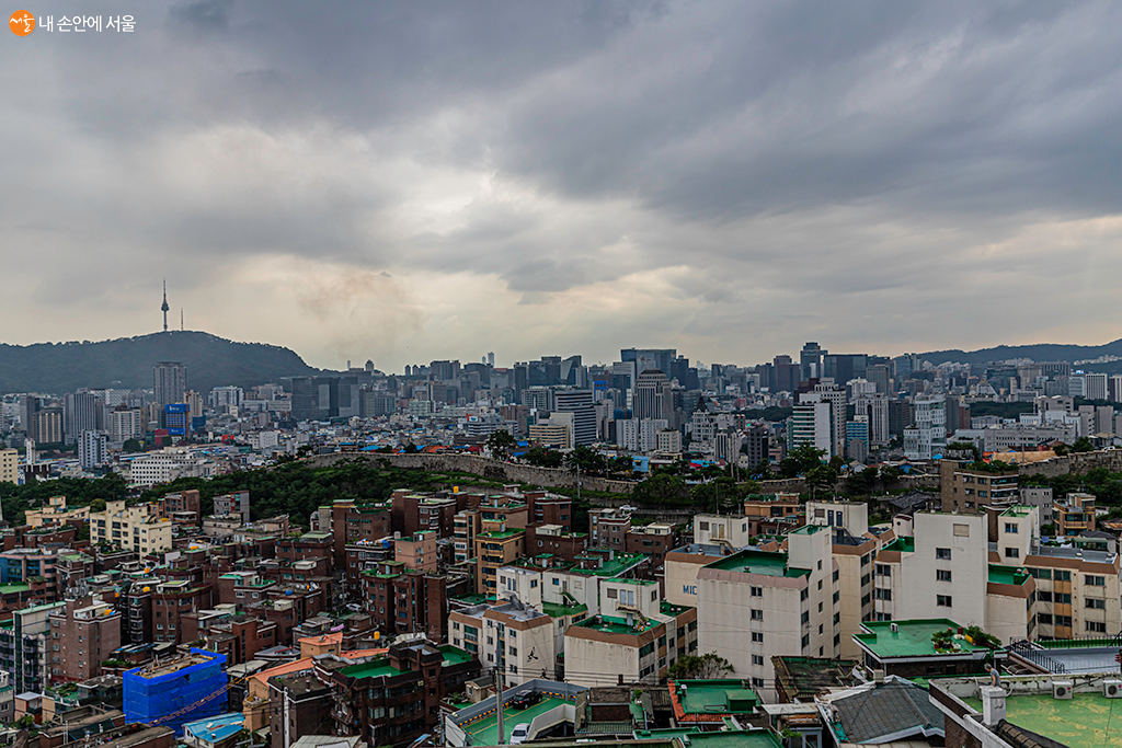 채석장 전망대 건너편에서 바라본 서울로 남산과 낙산성곽이 보인다 ⓒ유서경
