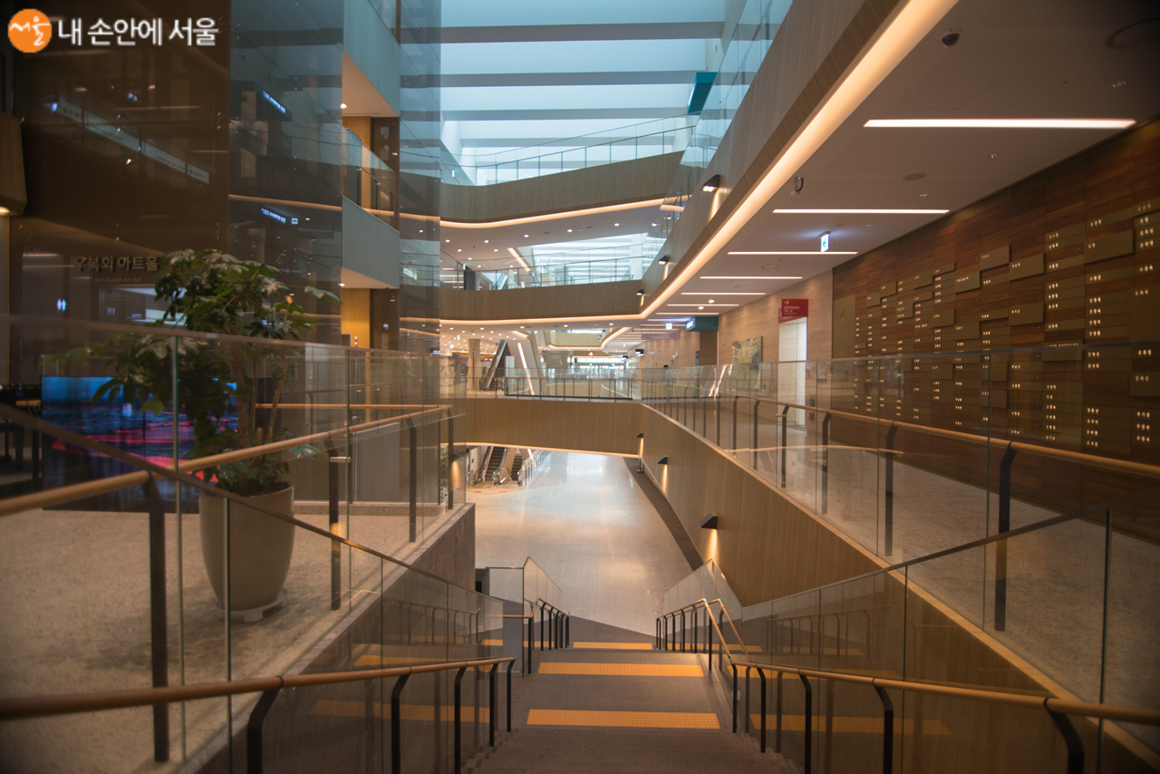 선과 면이 조화롭다. 지하로 내려가는 계단과 지상층 건물을 연결하는 구름다리 그리고 천정 채광 시설을 볼 수 있다 Ⓒ김인수