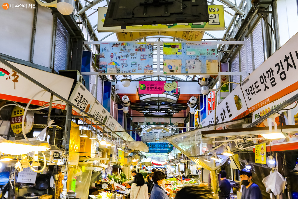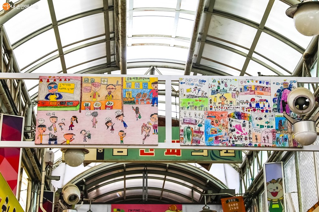 인근 어린이집 아이들이 직접 그린 송화전통시장 그림이 전시되어 있다 ©박우영