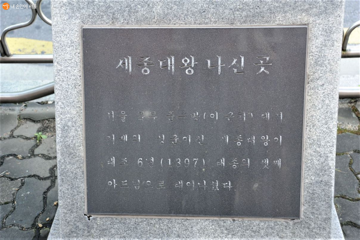 그런데 세종대왕의 탄생지가 궁궐이 아닌 이곳 서촌이었다는 것은 생소하기까지 하다. 정확한 생가 터는 아직 찾지 못하였고 대로변에 하나의 표석으로만 그 사실을 알리고 있는데 이곳 주민들은 2010년부터 세종대왕의 얼이 살아 있는 문화예술마을로 가꾸고자 동네 이름을 “세종마을”로 부르기 시작하였다. 소규모 갤러리, 공방들도 하나 둘 터전을 마련한 세종마을은 옛 정취와 현대의 멋을 찾기에 충분한 곳이다. 더욱이 수성동계곡의 풍경은 겸재 정선의 진경산수(眞景山水)를 보는 듯하여 더욱 친근하기만 하다.