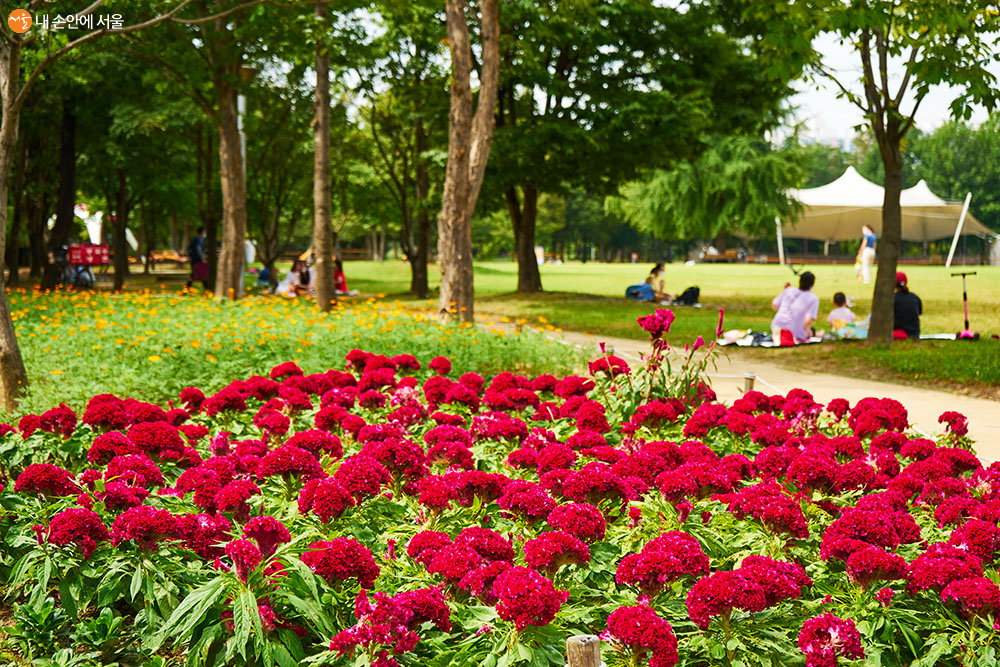 진홍빛 주먹맨드라미 너머 평화로운 휴식을 즐기는 시민들의 모습 ⓒ이정규